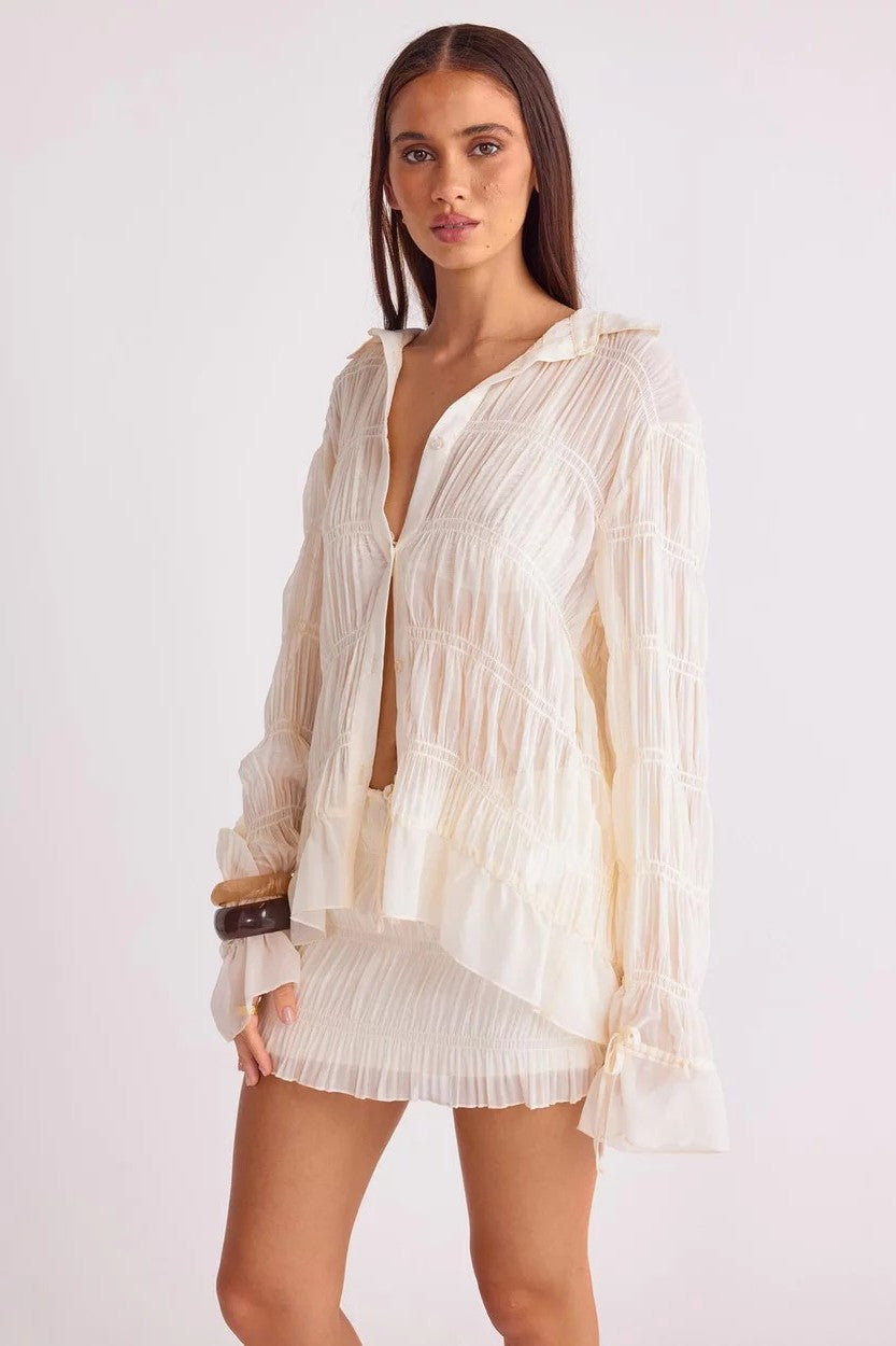 The La Louisiane Mini Skirt is made from a lightweight crinkle fabric with an elastic waist and drawcord. It has a textured finish.