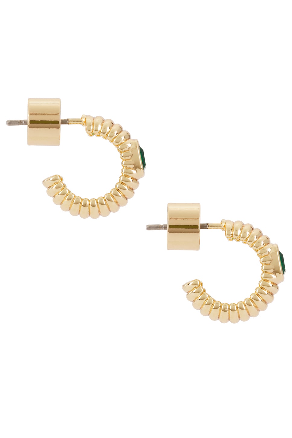The Textured Emerald Hoops are elegantly crafted in 18k gold plating, featuring a ribbed design that adds texture and sophistication. Each hoop showcases a single emerald crystal, providing a stunning pop of color and making these earrings perfect for both everyday wear and special occasions.